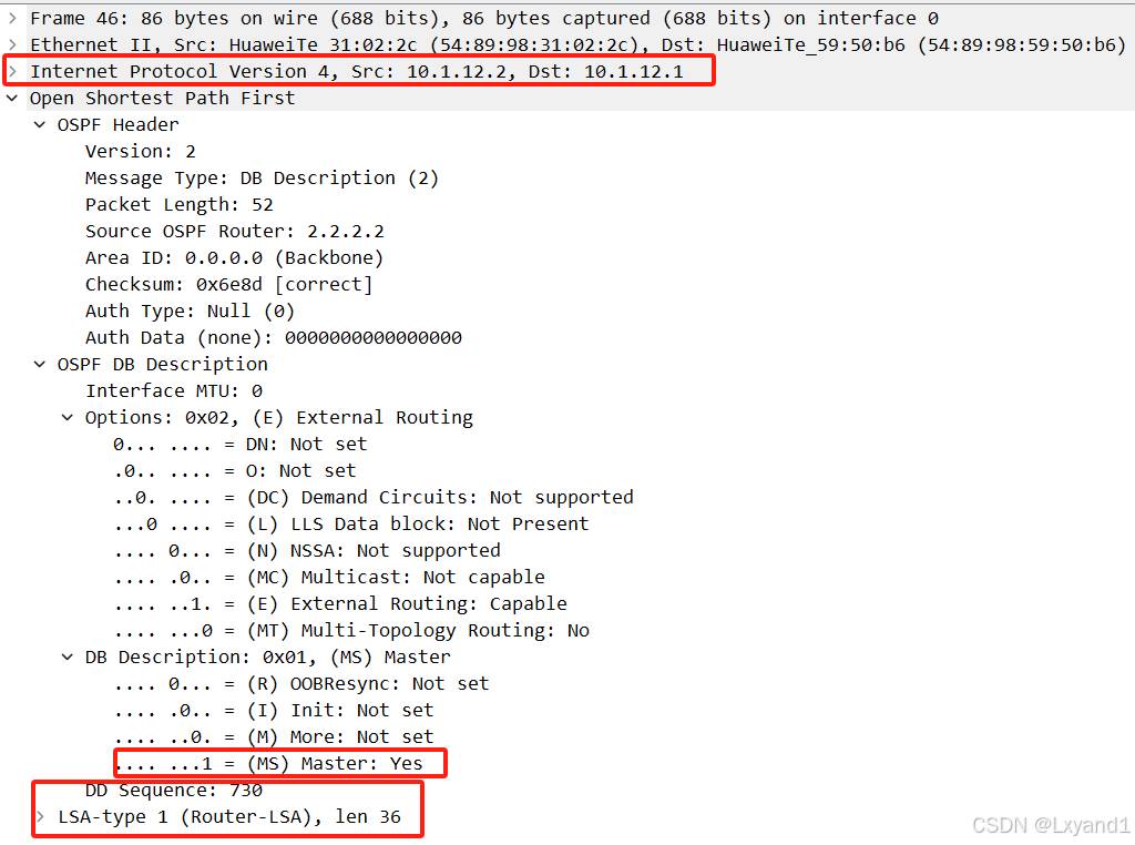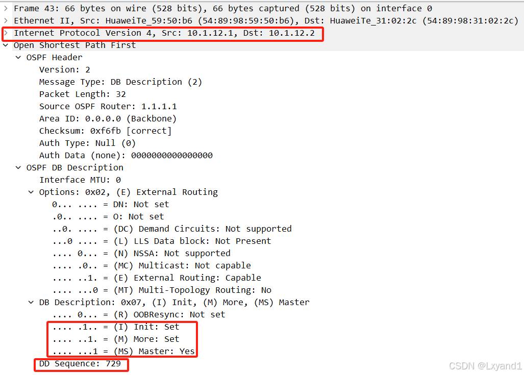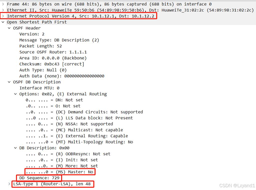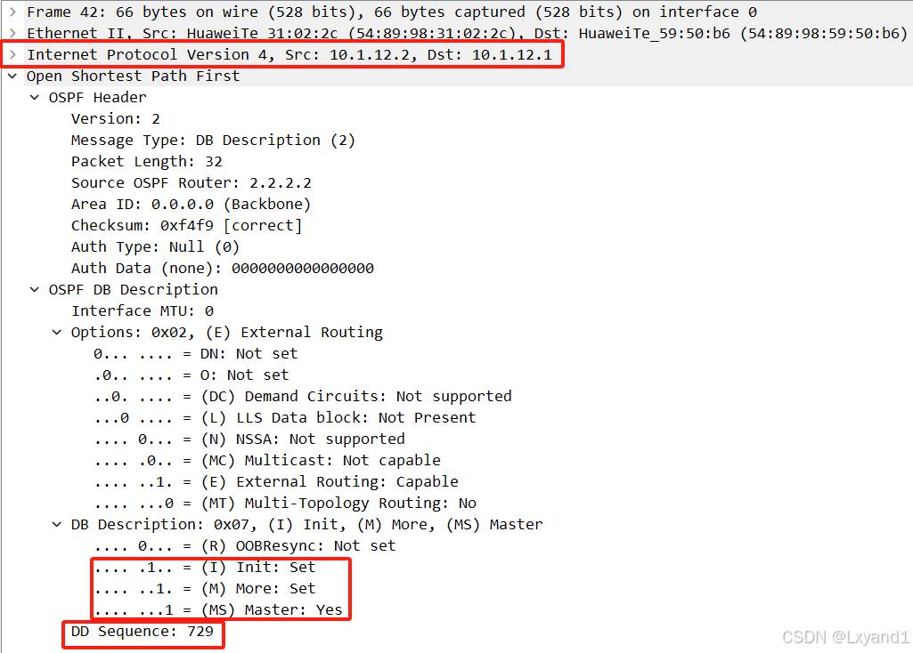 通过上面两个初始化的 DD 报文,可以看出,此 DD 报文只有一个头部信息,没有具体的数据库摘要信息,作用就是为了选举 Master和 Slave。选举 Master和 Slave 的目的是为了控制序列号的顺序,以此保证后期 DD 报文的可靠性。