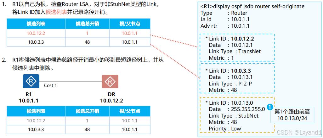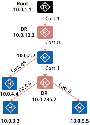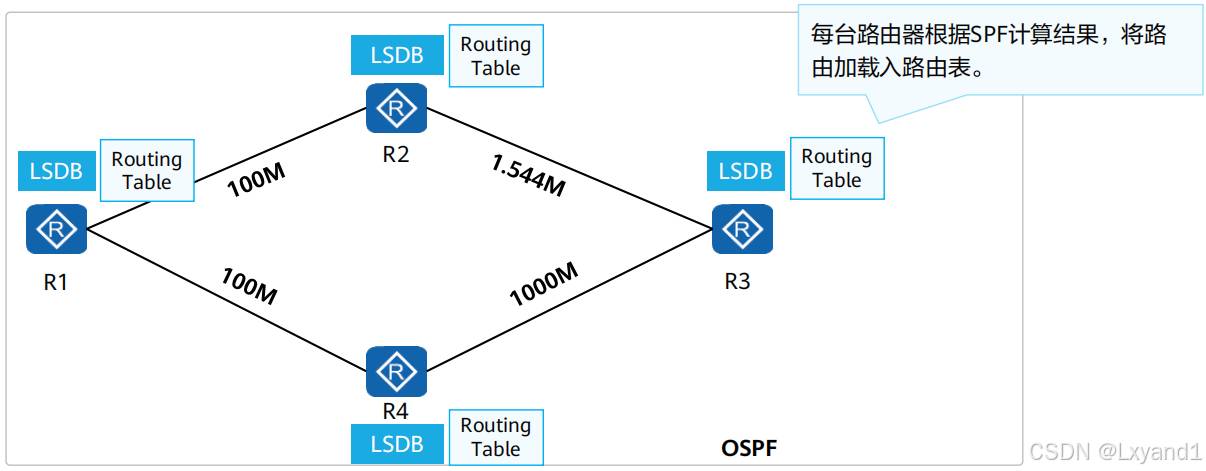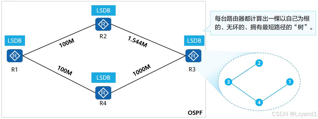 每台路由器基于LSDB,使用SPF(Shortest Path first,最短路径优先)算法进行计算。每台路由器都计算出一棵以自己为根的、无环的、拥有最短路径的“树”。有了这棵“树”,路由器就已经知道了到达所有网段的优选路径。