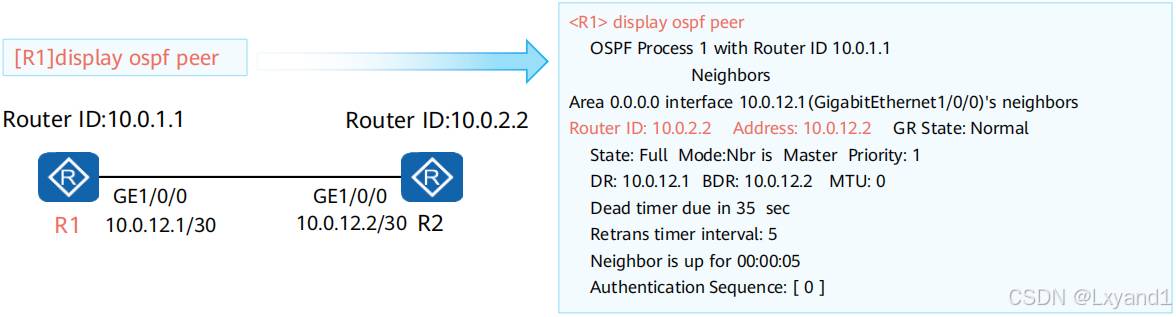 • OSPF邻居表显示了OSPF路由器之间的邻居状态,使用display ospf peer查看。