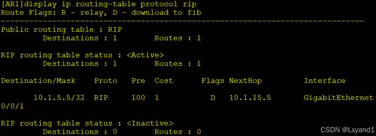 • 在AR1上查看从RIP学习到的路由