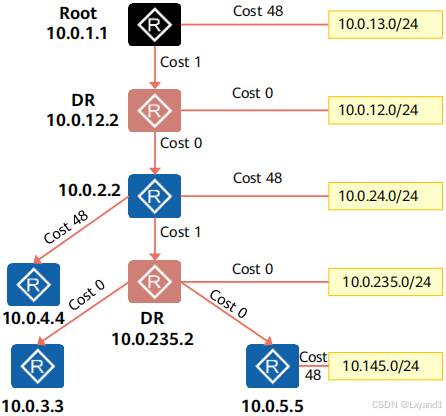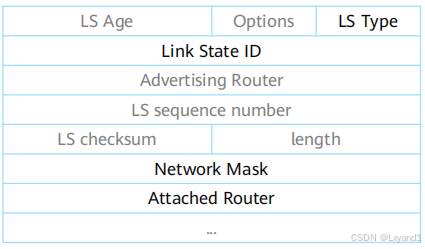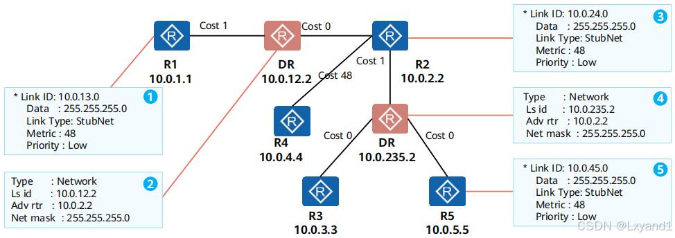 • 通过以上信息得知,2类LSA只能在所属区域泛洪,通告者为 DR,传递的内容为 transit网络掩码及拓扑信息。