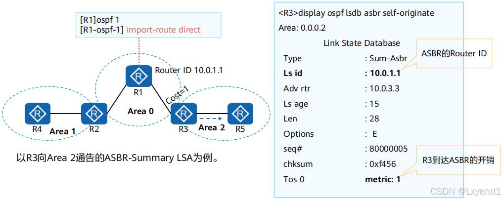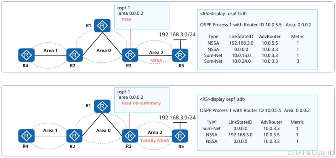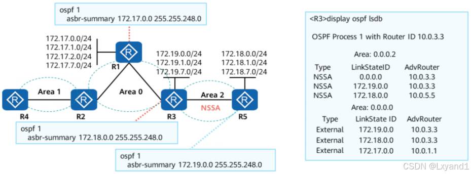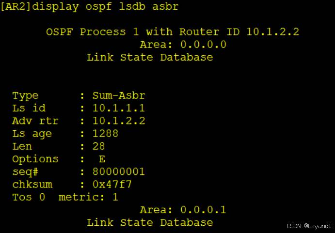 • 此 4类 LSA 表达的意思为可以通过 AR2 设备,到达目标设备 ASBR 1.1.1.1,且开销为此时其他区域有了4类LSA的指引,就知道了5类LSA的方向,就可以计算外部路由。接下来将区域1 配置为 NSSA 区域。(本基本配置省略)