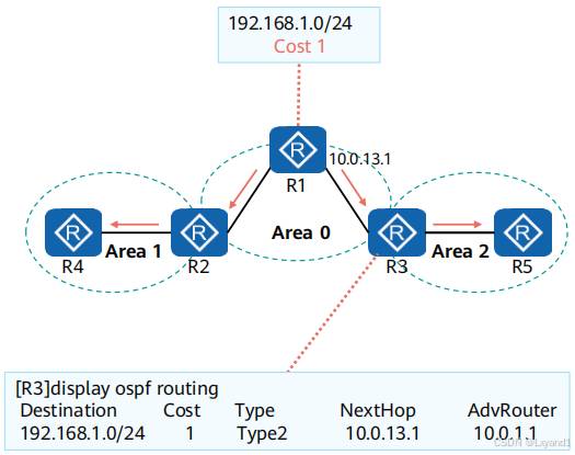 • OSPF的区域ID是一个32bit的非负整数,按点分十进制的形式(与IPv4地址的格式一样)呈现例如Area0.0.0.1。为了简便起见,我们也会采用十进制的形式来表示。