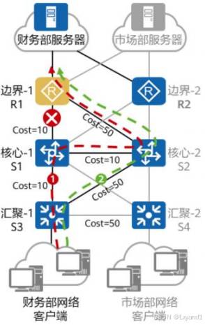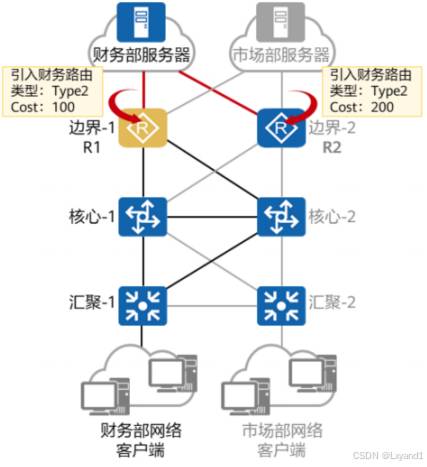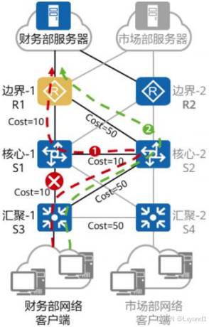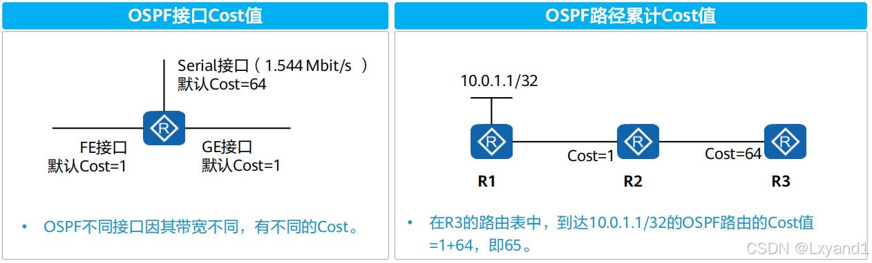• OSPF以“累计cost”为开销值,也就是流量从源网络到目的网络所经过所有路由器的出接口的cost总和。