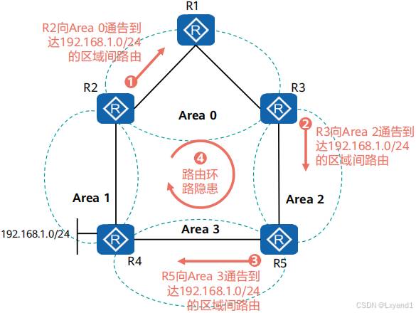 • 从5类LSA 中可以看到,5类 LSA主要用来传递外部路由,并且它不像1类、2 类、3 类有区域所属,它不属于任何一个区域,所有5类 LSA 的泛洪范围为整个 OSPF 区域,并且在整个 OSPF 区域中进行泛洪时所有信息保持不变,那么此时其他区域就无法知道通告者是谁,无法知道通告者也就无法进行路由计算。(本区域有本区域的完整的数据库,很清楚的知道通告者 1.1.1.1 是谁,但是其他区域,比如区域0、区域2不知道谁是1.1.1.1,此时就需要使用 4类 LSA。)