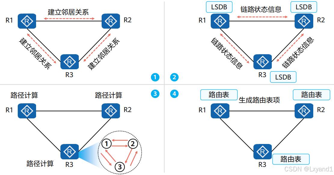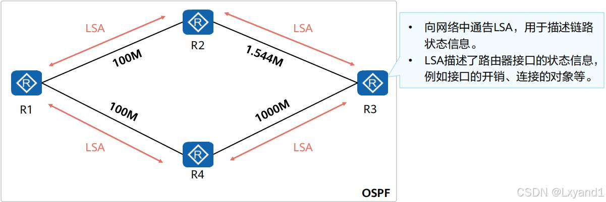 运行链路状态路由协议的路由器之间首先会建立邻居关系,然后彼此之间开始交互LSA(LinkState Advertisement,链路状态通告)。