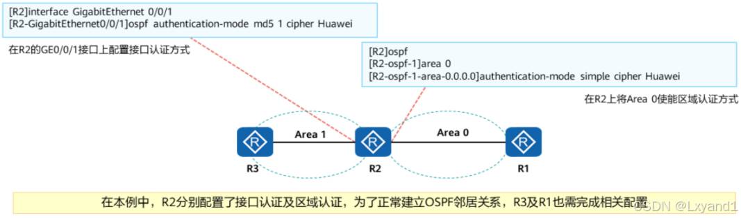• 区域认证,配置在某个区域,在本设备上属于本区域的接口发出的 OSPF 报文都会携带认证信息。