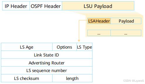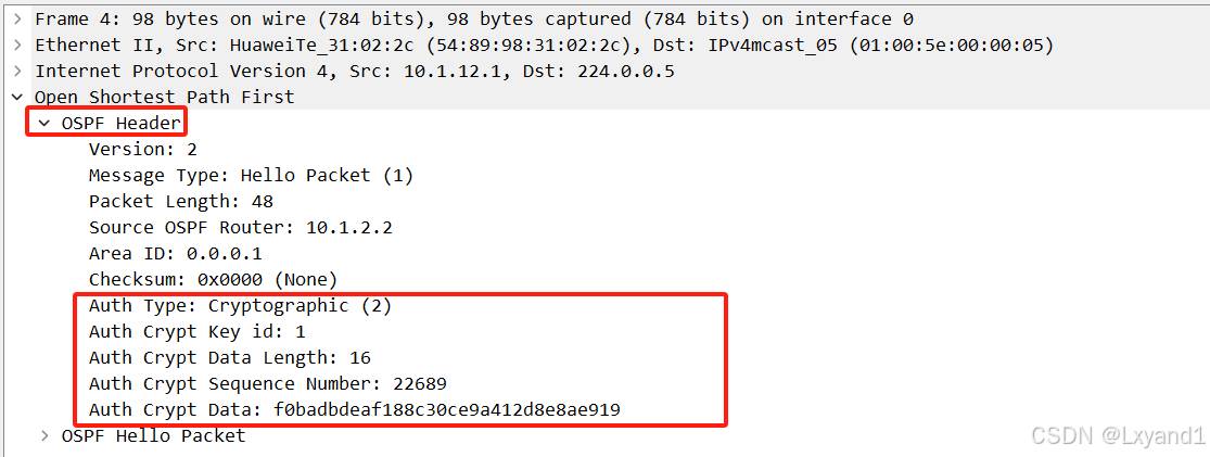 所以 OSPF 的认证信息是封装在 OSPF 报头中,而不是说封装在 OSPF的 hello 包、LSR、LSU 等报文。