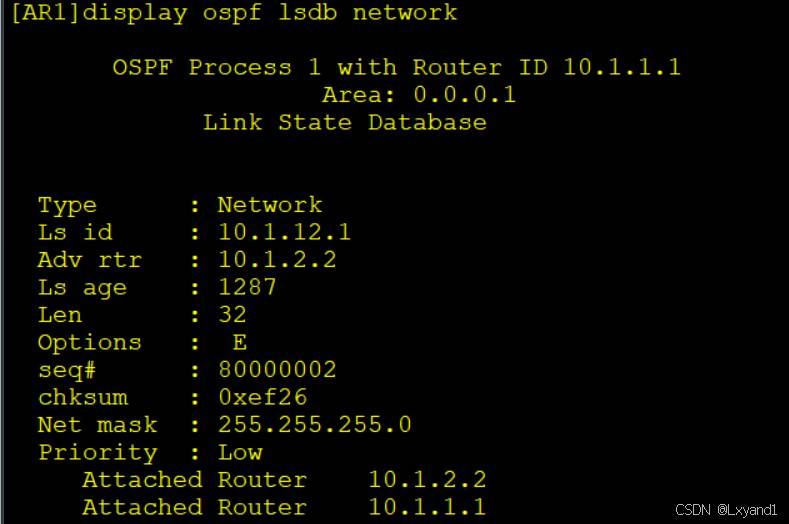• 通过命令可以看到在区域1中只有两个1类LSA,分别由AR1和 AR2产生。作业就是为了描述本区域的拓扑数据库及传递路由信息,只能在所属区域内泛红。在该区域1中,AR1的 loopback0 口在 LSA 中携带了其掩码信息,但是两台路由器互联网段没有包含掩码信息。此时需要在此处查看2类LSA。