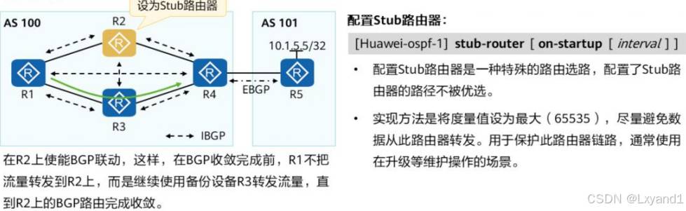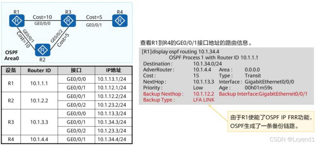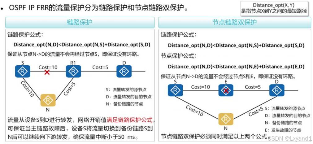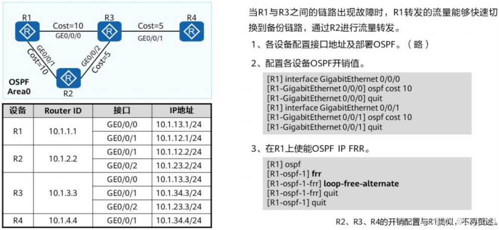 • 所以,在生产中我们可能会运用到一项技术就是 OSPF IP FRR,这项技术的原理是在主链路正常的时候就将备用链路提前计算好,方便如果主链路产生故障的时候在 50 毫秒内切换到备用链路上,保证通信的正常进行,但是配置 FRR后,被选成备用链路是有条件的,必须要满足链路保护公式:就是图中  R4到R3的开销 < R4到R1+R1到R3的。这样可以保证没有环路产生。