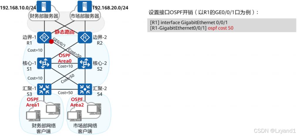• OSPF使用Cost(开销)作为路由的度量值。每一个激活了OSPF的接口都会维护一个接口Cost值,缺省的Cost =100 Mbits/接口带宽。其中100 Mbit/s为OSPF指定的缺省参考值,该值是可配置的。
