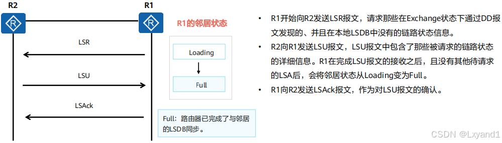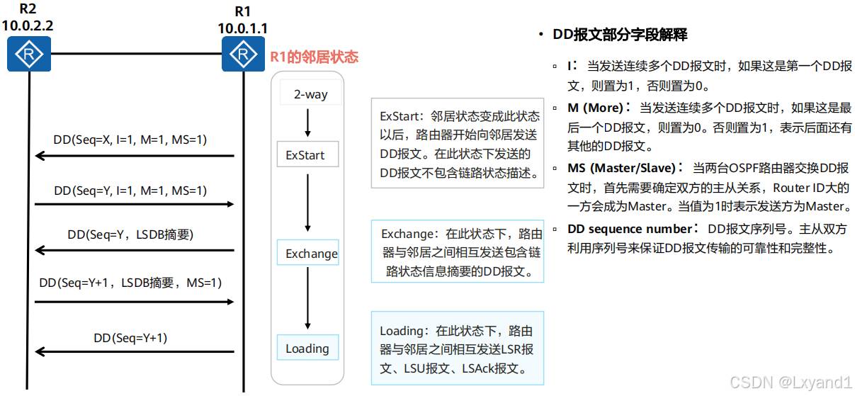 • 交互DD报文并发送LSR请求LSU,并进入Exchange状态