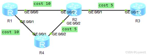 • 完成拓扑的底层配置,配置接口的IP地址,每台路由器都运行 OSPF,全部宣告到区域1中。R3 新建环回口 10.1.3.3 也宣告到区域1中,修改链路上的 OSPF 开销值为上图中的数值。