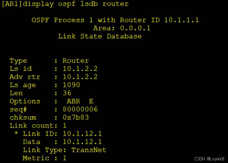 【5】接下来观察各类LSA。首先在AR1上观察1类LSA(Router LSA)。