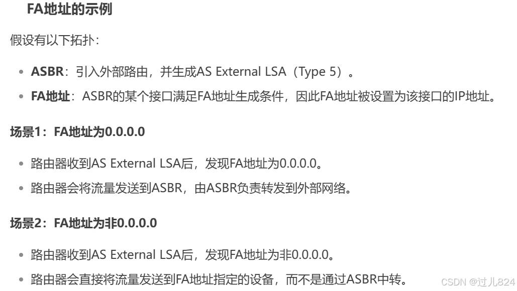 FA地址(转发地址):OSPF的区域外防环机制通过FA地址(Forwarding Address)实现,FA地址用于指示外部路由的下一跳地址。ASBR的某个接口满足FA地址生成条件,因此FA地址被设置为该接口的IP地址。