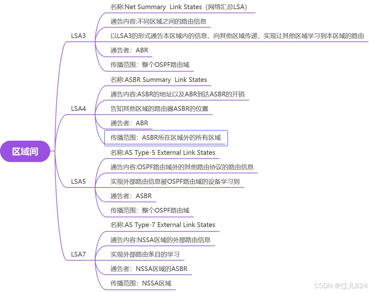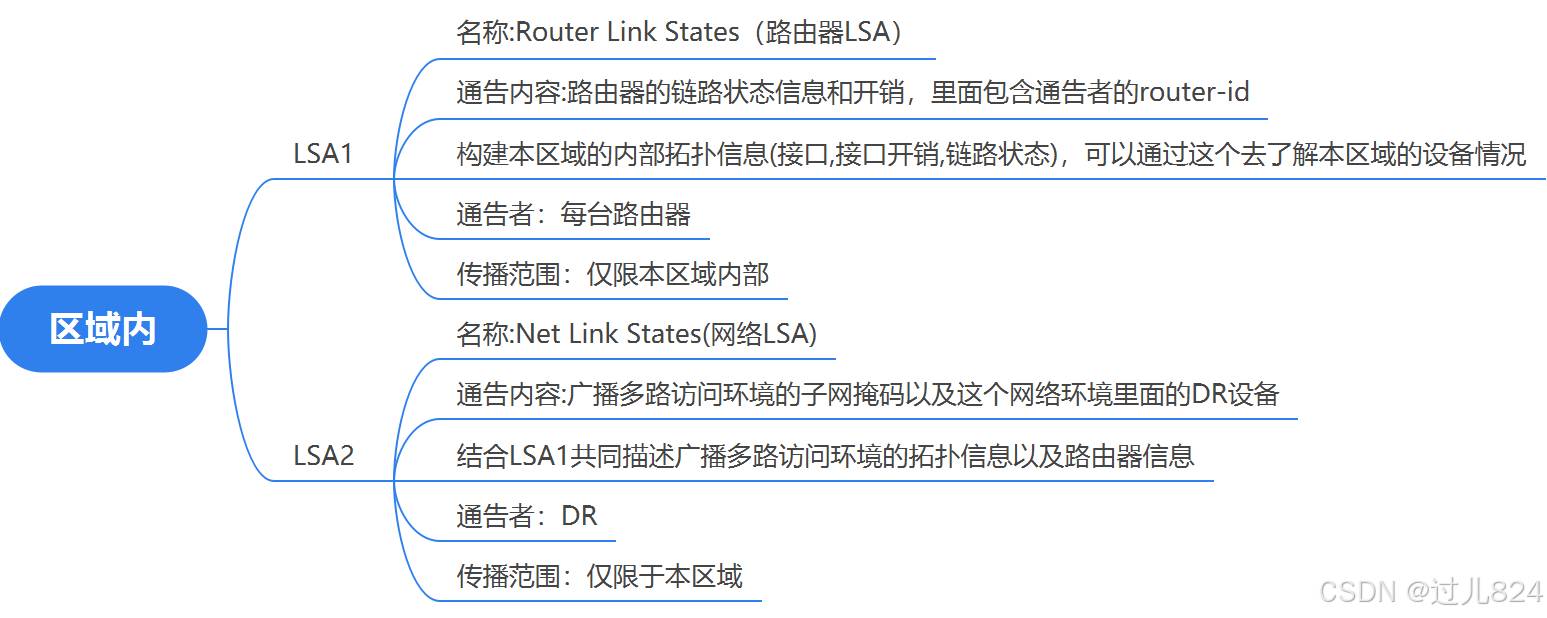 LSA:Link State Advertisement,链路状态通告,路由器发出的关于网络结构的通告,描述了链路或接口的状态及每条链路的成本