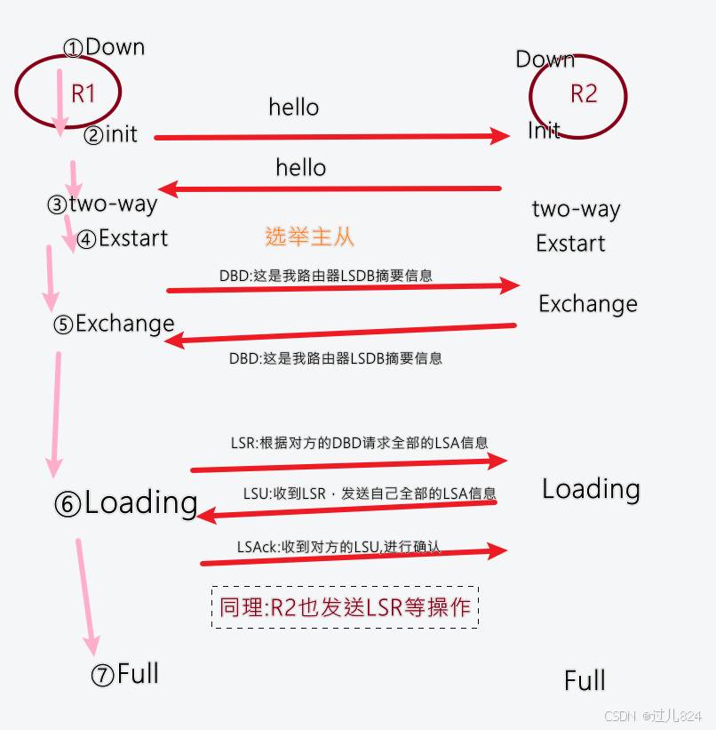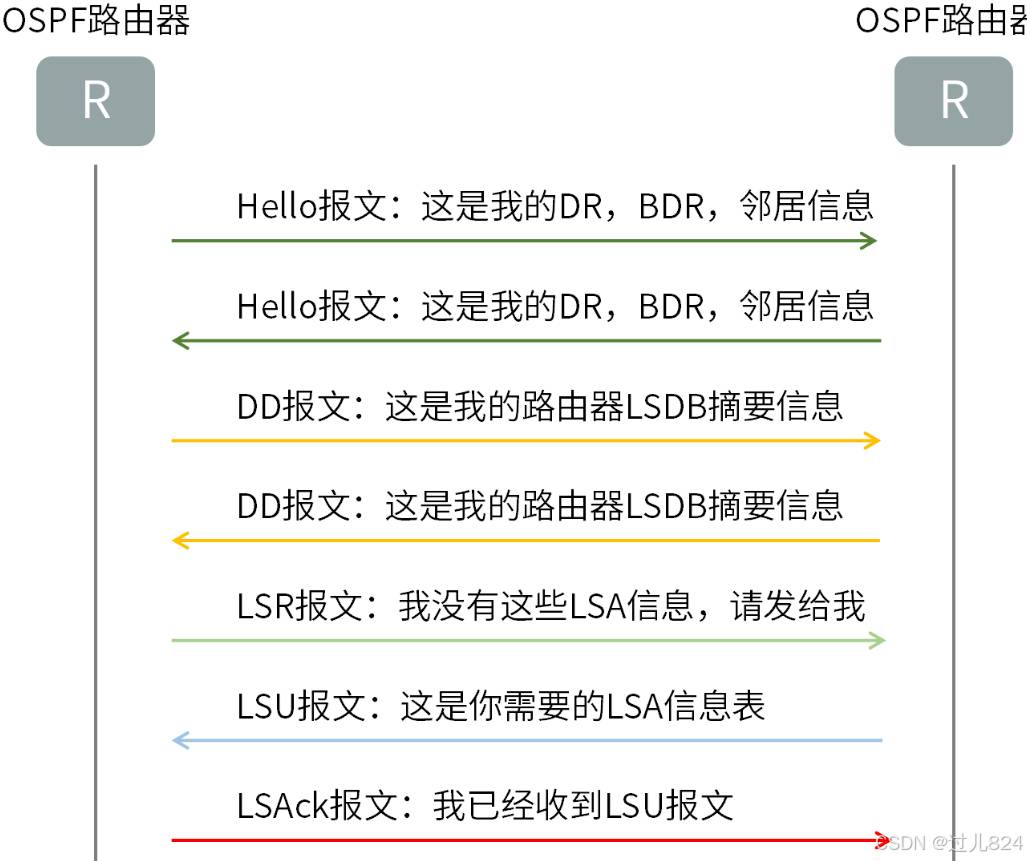 请求对方的LSA全部信息,交互LSR、LSU、LSAck