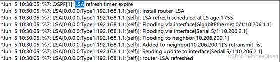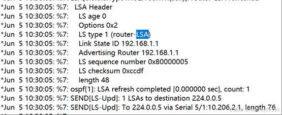 【4】使用#debug ip ospf命令显示上述OSPF协议的运行情况,观察并保存路由器R1发送和接收的Update分组(可以通过改变链路状态触发),注意其中LSA类型;观察有无224.0.0.5、224.0.0.6的IP地址,如有请说明这两个地址的作用。