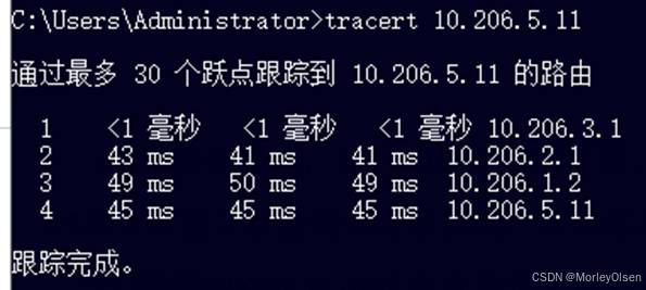 可以发现,PC2首先通过10.206.3.1进行第1跳,此时经过了路由器R2;然后通过10.206.2.1进行第2跳,此时经过了路由器R1;接着通过10.206.1.2进行了第3跳,此时经过了三层交换机;最后在三层交换机的另一侧连接到10.206.5.11。