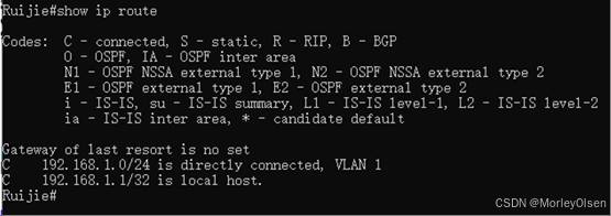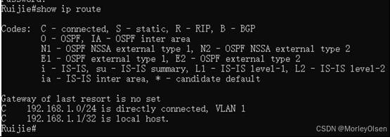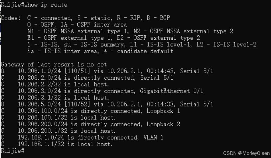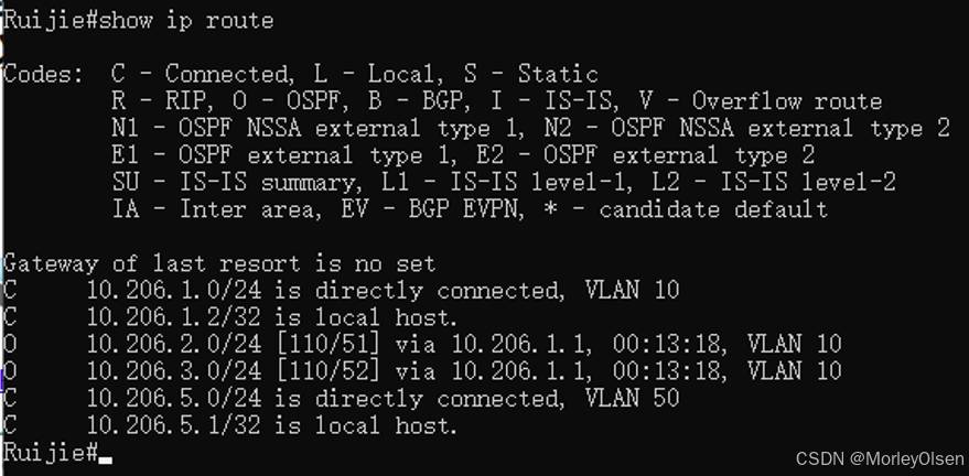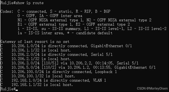 交换机配置后的路由表,如下图所示。可以看到有2条O项路由条目。