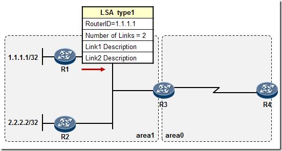 例如上图中,所有OSPF路由器都会产生1类LSA,并且在本区域内泛洪。我们以R1举例,它会产生一个类型1的LSA,那么在这个LSA1中,包含两个链路的描述,一个用于描述Loopback接口以及接口的COST值,另一个是描述GE0/0/0接口以及COST值。这个1类LSA会在area1内泛洪。