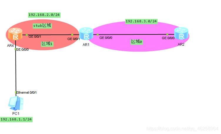 #在R2的GE0/0/0及GE0/0/1口上激活OSPF,需留意,R2是ABR,因此要注意激活的OSPF接口所在的区域。
