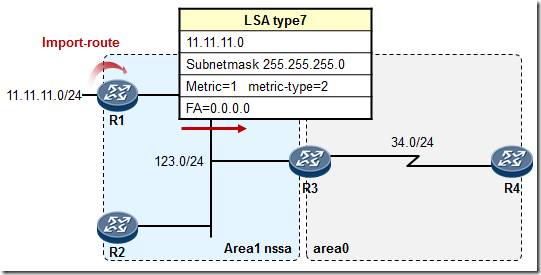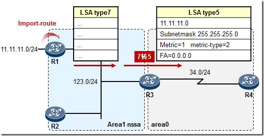 允许出现1/2/3/7类LSA , 会生成一条缺省的7类LSA ,不允许出现的4/5LSA,在ABR上 7类自动转为5类