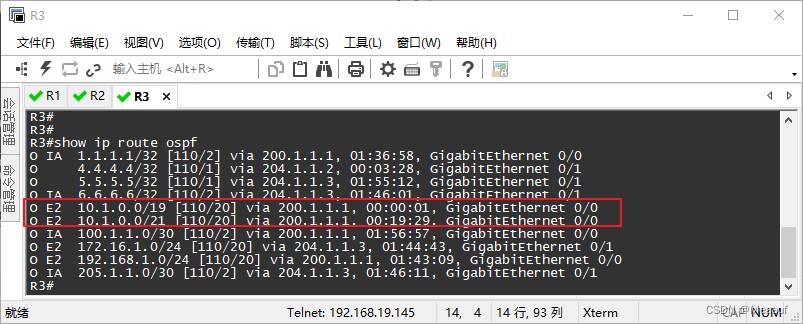 可以看到 R2 路由表中拥有一台 PC 所属的路由,所以为了减少 LSDBType-3LSA 的数目,使用聚合路由