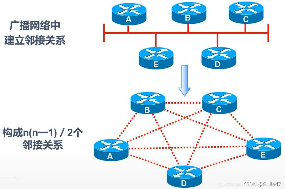 例:广播网络中,ABCDE五个路由器相互建立邻接关系,构成了很多的邻接关系,很繁琐