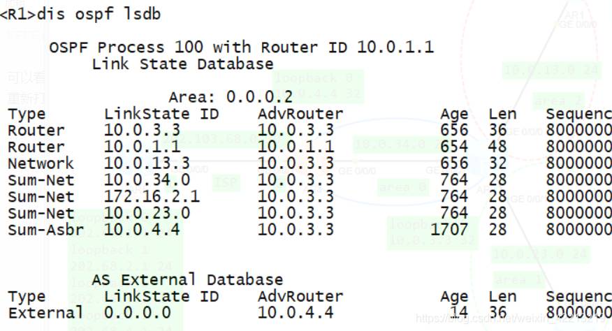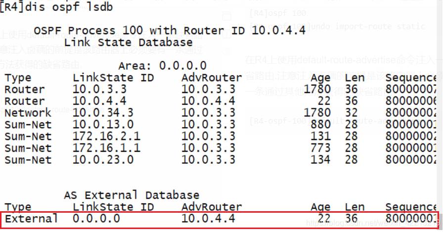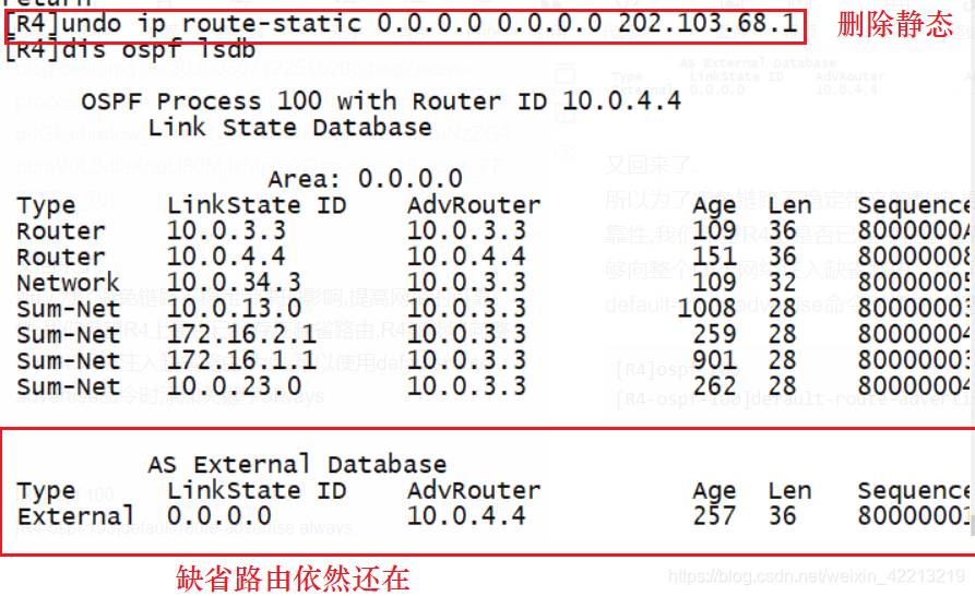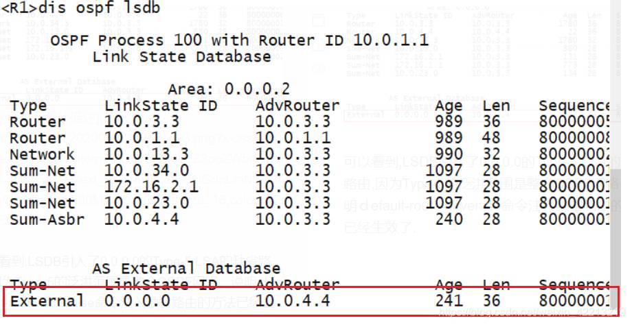可以看到,LSDB 没有出现 0.0.0.0 的 LSA, 表示 OSPF 网络规定不允许通过 import-router static 命令注入缺省路由