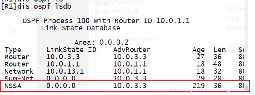 可以看到,和 NSSA 区域一样,进入 Totally NSSA 区域的是一条表示缺省路由的 Type-7 LSA。