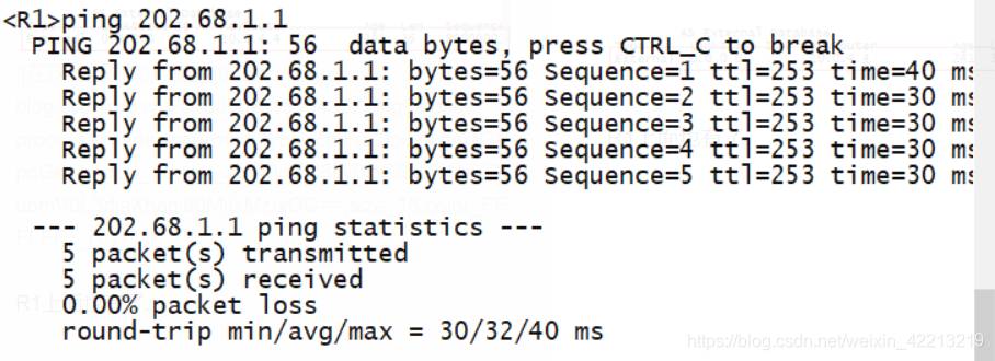 在 R1 上面 ping 202.68.1.1 能 ping 通,表示内部网现在可以与外部网络连接起来了。