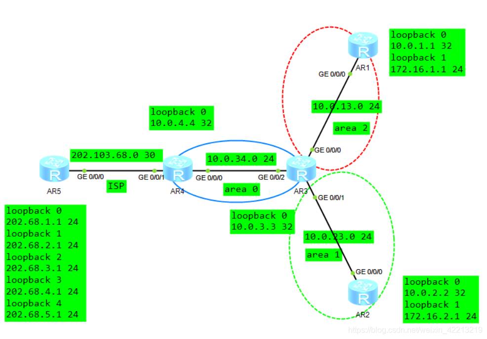 两个 ABR 连接两个 ISP ,提供热备冗余备份。经测试,在骨干区域 ABR 打入这个命令会向骨干和非骨干都会通告,但一般用在边界的两个 ABR 上面。全 ospf 通告泛洪。
