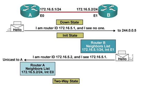 Init State:初始化状态,即等待建立邻居关系的状态。在收到包含有自己RID的Hello包后,则与对方一起进入下一个状态(双向连接状态)。