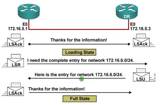 Loading State:加载状态,根据对比拓扑目录信息找出本地缺少的信息,然后使用LSR、LSU与LSAck包来进行具体拓扑信息的共享,实现OSPF收敛