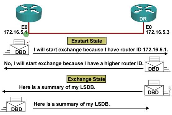 Exstart State:预启动状态,使用假DBD(效果类似Hello包,但无需Ack确认,采用隐性确认的方式)双方比较RID,进行主从关系的选举(从会使用主的序列号发包以表示选举结果),RID大者优先进入下一个状态(准交换状态)。