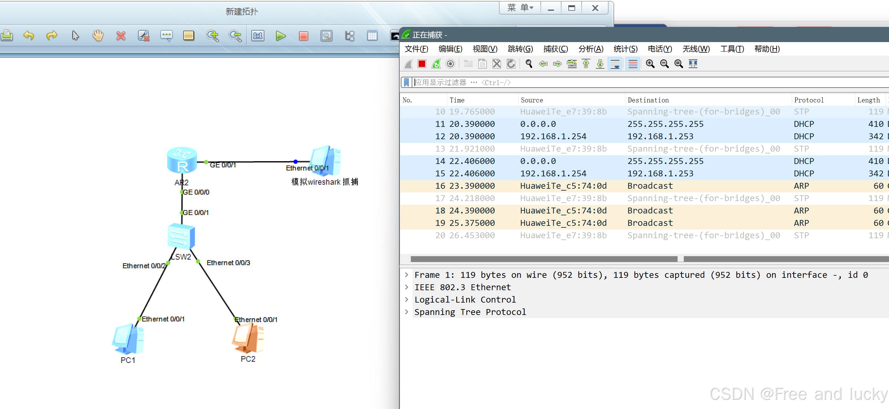 在上图中,PC1和PC2充当模拟终端,通过DHCP自动获取IP地址。当前,位于AR2左侧的终端使用Wireshark对g/0/0/0接口下的数据包进行捕获。
