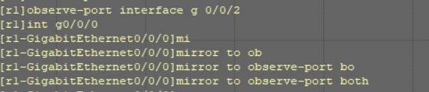 mirror to observe-port both #其中 “ both ”表示接收来去的数据包,“ inbound ”表示只把进入0/0/0端口的数据复制到0/0/2端口中,“ outbound ”表示只把从0/0/0端口发出去的数据复制到0/0/2端口中