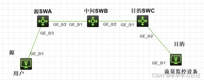 如图,SWA为源设备,GE1/0/3为被镜像的源端口,GE1/0/2为出口,GE1/0/6为反射端口。SWB为中间设备,SWC为目的设备,GE1/0/2为目的端口,下联流量分析设备。