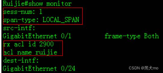 Ruijie(config)#monitor session 1 destination interface gigabitEthernet 0/24 ------>设置端口镜像目的端口