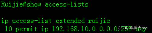 Ruijie(config)#ip access-list extended ruijie ------>创建ACL,名称为ruijie