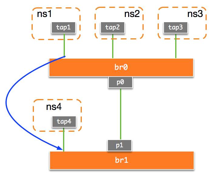 这种方式对应了Cisco的SPAN方式, 下面我们来实验RSPAN方式。我们将拓朴修改为如下图所示,我们首先在br0上将tap1的数据包镜像到物定VLAN: 111, 在br1上再从VLAN: 111中将数据包镜像到tap4: