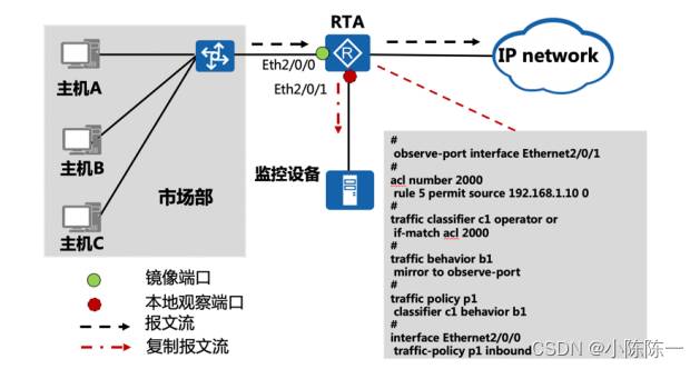 端口镜像(port Mirroring)功能通过在交换机或路由器上,将一个或多个源端口的数据流量转发到某一个指定端口来实现对网络的监听,指定端口称之为“镜像端口”或“目的端口”,在不严重影响源端口正常吞吐流量的情况下,可以通过镜像端口对网络的流量进行监控分析。在企业中用镜像功能,可以很好地对企业内部的网络数据进行监控管理,在网络出故障的时候,可以快速地定位故障。