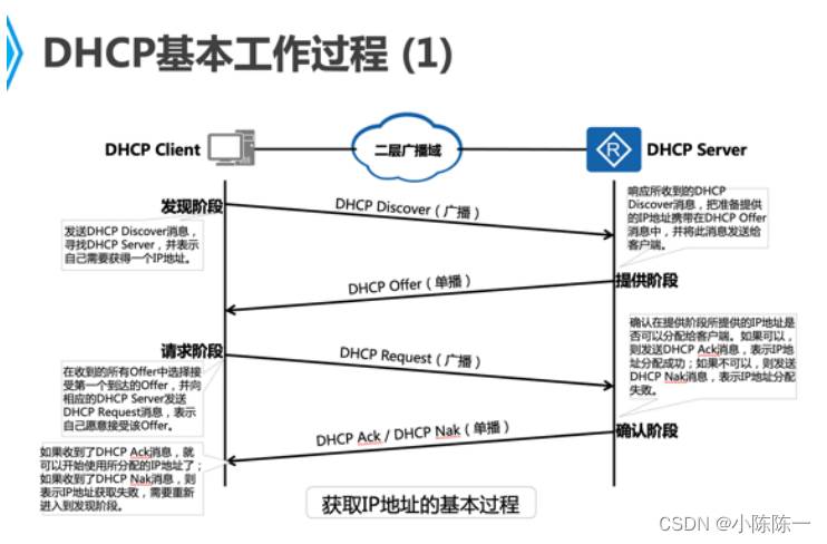 (1)主机发送DHCP的Discover请求包:三层(源IP0.0.0.0 目标IP255.255.255.255;源MAC=PC,目标MAC全F) 通过广播发给服务器;第四层DHCP基于67 68 传输层;五层 应用层有一张调查问卷问题表空着的表 发给服务器 广播