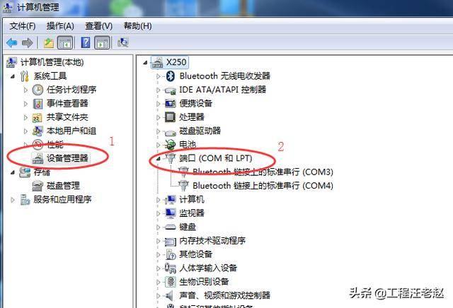点击"设备管理器",选择"端口(COM和LPT)",并记下端口号