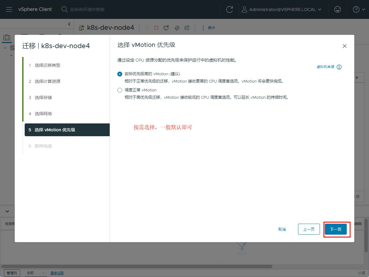 6、选择目标主机的 vMotion 选项,一般默认即可