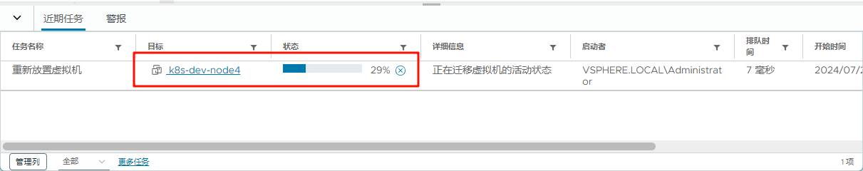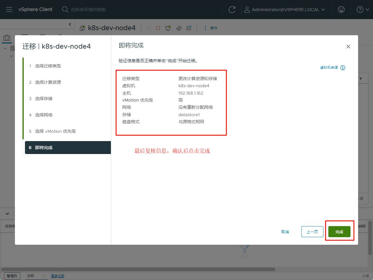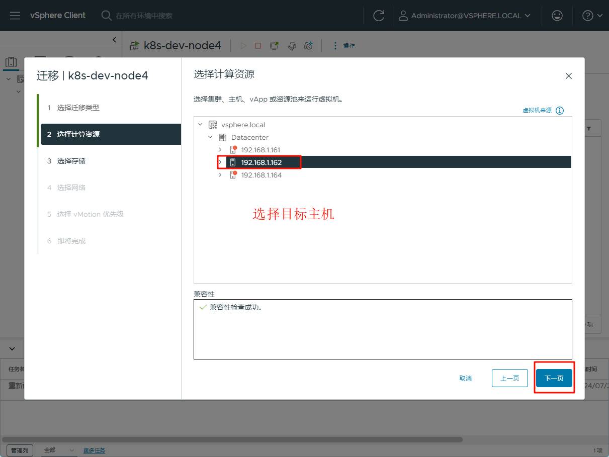 我需要将虚拟机 k8s-dev-node4从 ESXi 主机 192.168.1.161 迁移到 ESXi 主机 192.168.1.162 上,使用 VMware vCenter Server(vSphere Client)在浏览器上可视化操作,将这个需求变的非常简单。