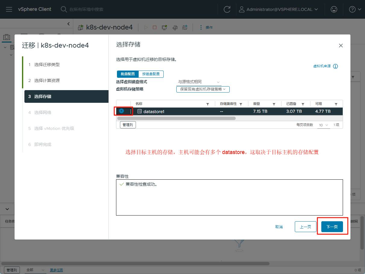 4、选择迁移到的目标主机上的存储