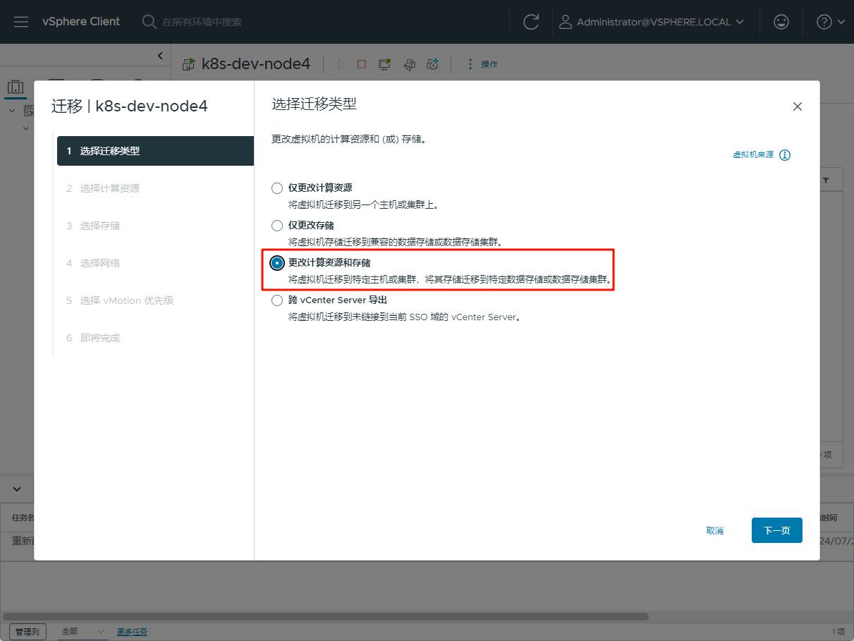 我需要要完全迁移整个虚拟机,所以选择第三个选项 “更改计算资源和存储”。这将确保虚拟机及其所有数据都被完整地迁移到新的位置。