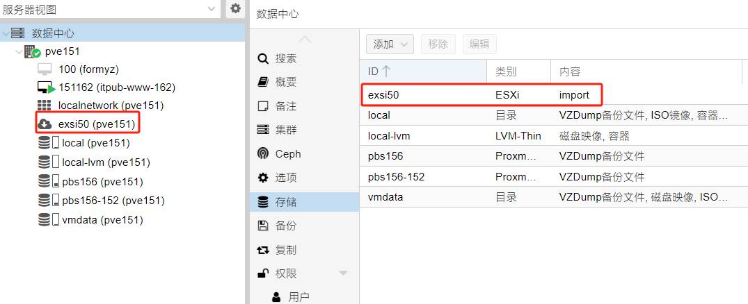 Proxmox VE 8.2发布后,在其存储菜单下,新增了一个ESXI(如下图所示),使用这个功能,大大简化了ESXi虚拟机迁移到虚拟机的步骤,而且能大大节省迁移时间,因为没有ESXI虚拟机的备份、复制备份文件这个比较耗时的过程。